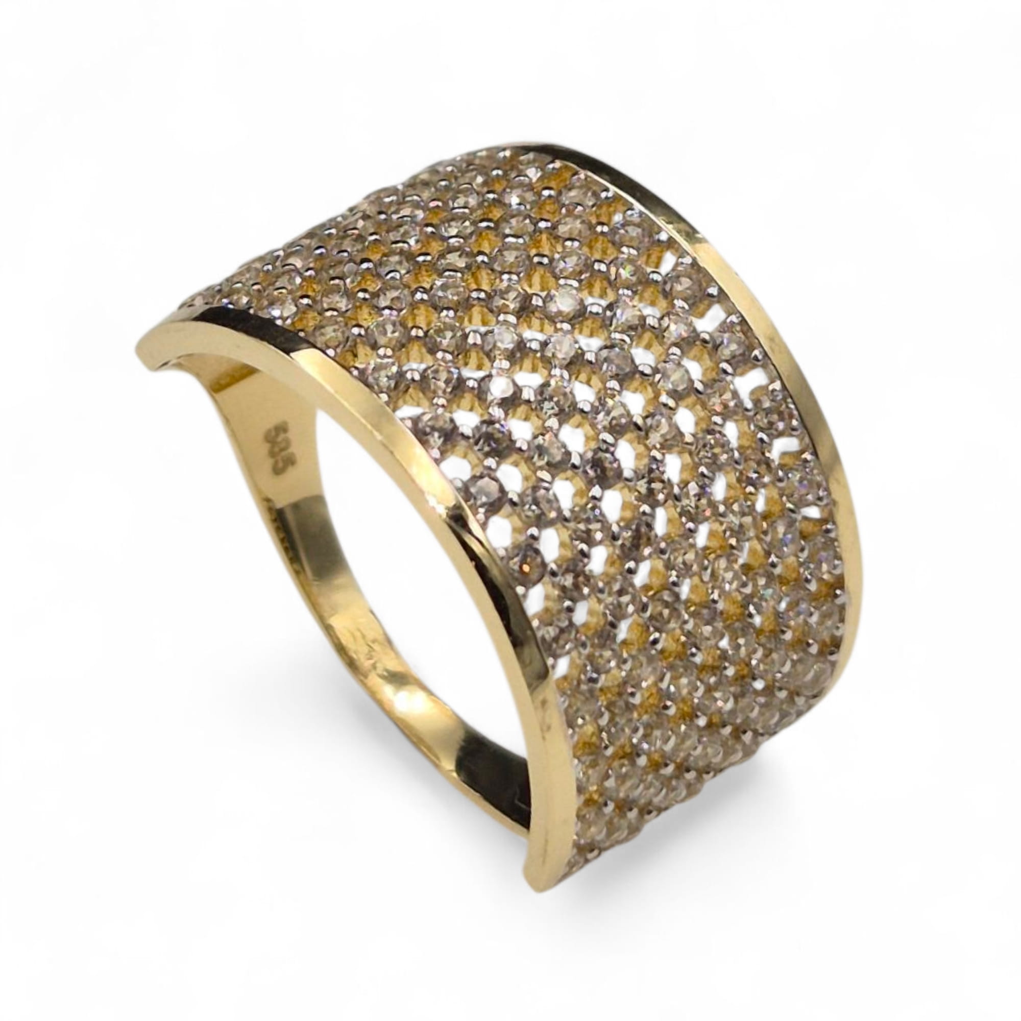 Złoty pierścionek z szerokim elementem z wieloma białymi cyrkoniami. Okazała i, z pewnością, przyciągająca uwagę propozycja, idealna na ważne wyjścia, czy okazję jako dodatek do stylizacji.
